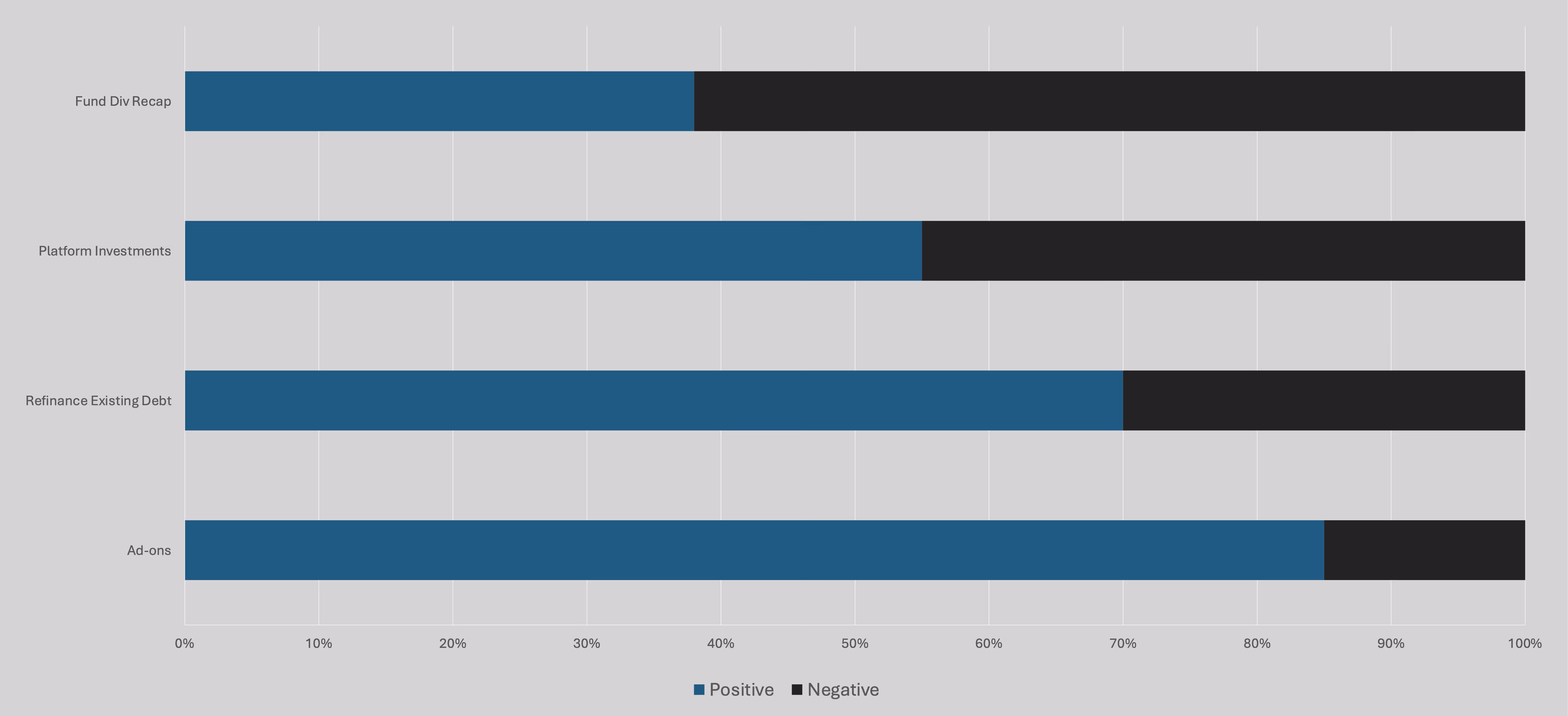 These views are echoed in recent LP surveys. According to the same Rede Partners report, LPs are supportive of “money in” transactions: add-ons (86 percent support), refinancing debt of a portfolio company, particularly if the cost of capital is lower than dilutive capital (71 percent support) and to a lesser degree, new platform investments (53 percent support). On the other hand, only 38 percent of surveyed participants are supportive of using a NAV loan for a fund dividend recap.