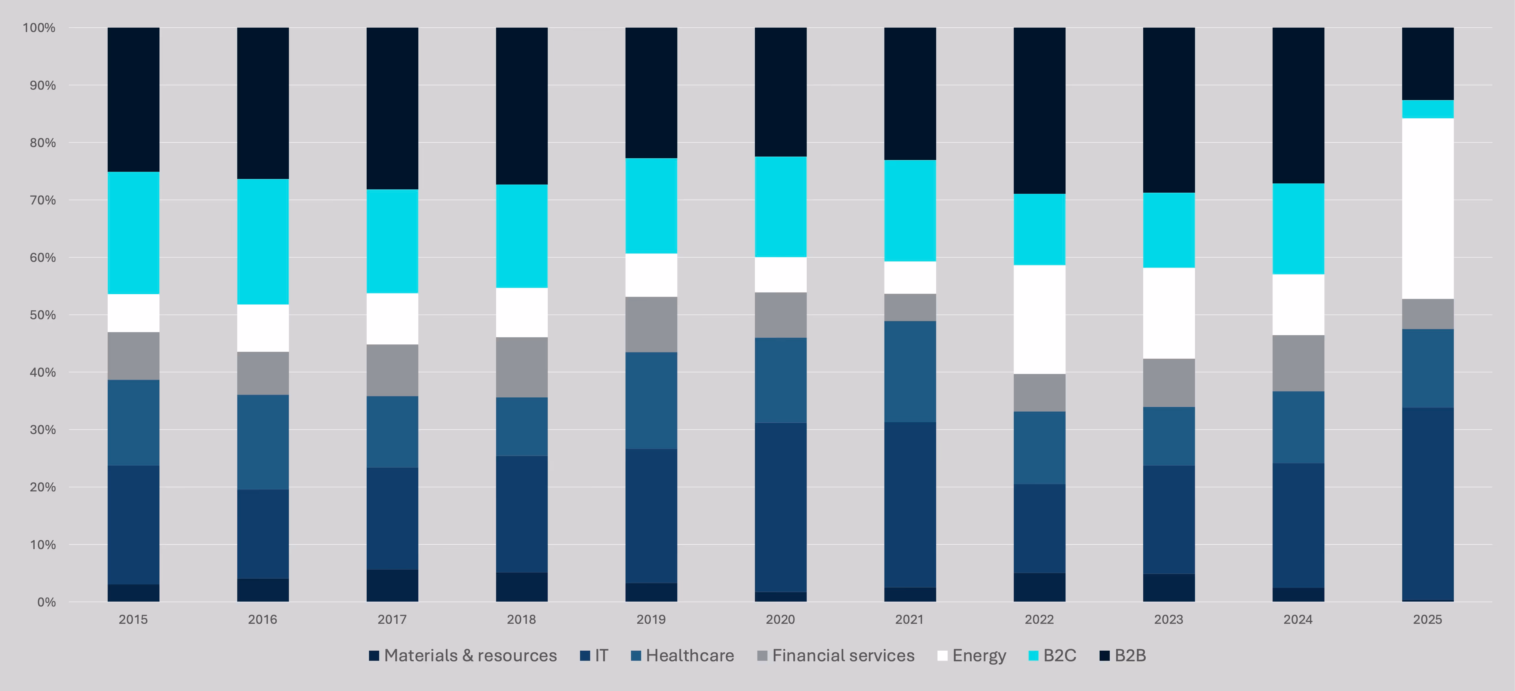 The chart below shows that B2B and B2C companies represented only ~16% of exit value in 2025 through Q2. This combined total represents a steep decline from 2024 when the industries combined for ~43% of exit value, and the lowest combined total since Pitchbook began collecting the data in 2011. The limited exit activity in the B2B and B2C industries reflects the significant recent headwinds faced by these industries and corresponding impact on their valuations and investor appetite.