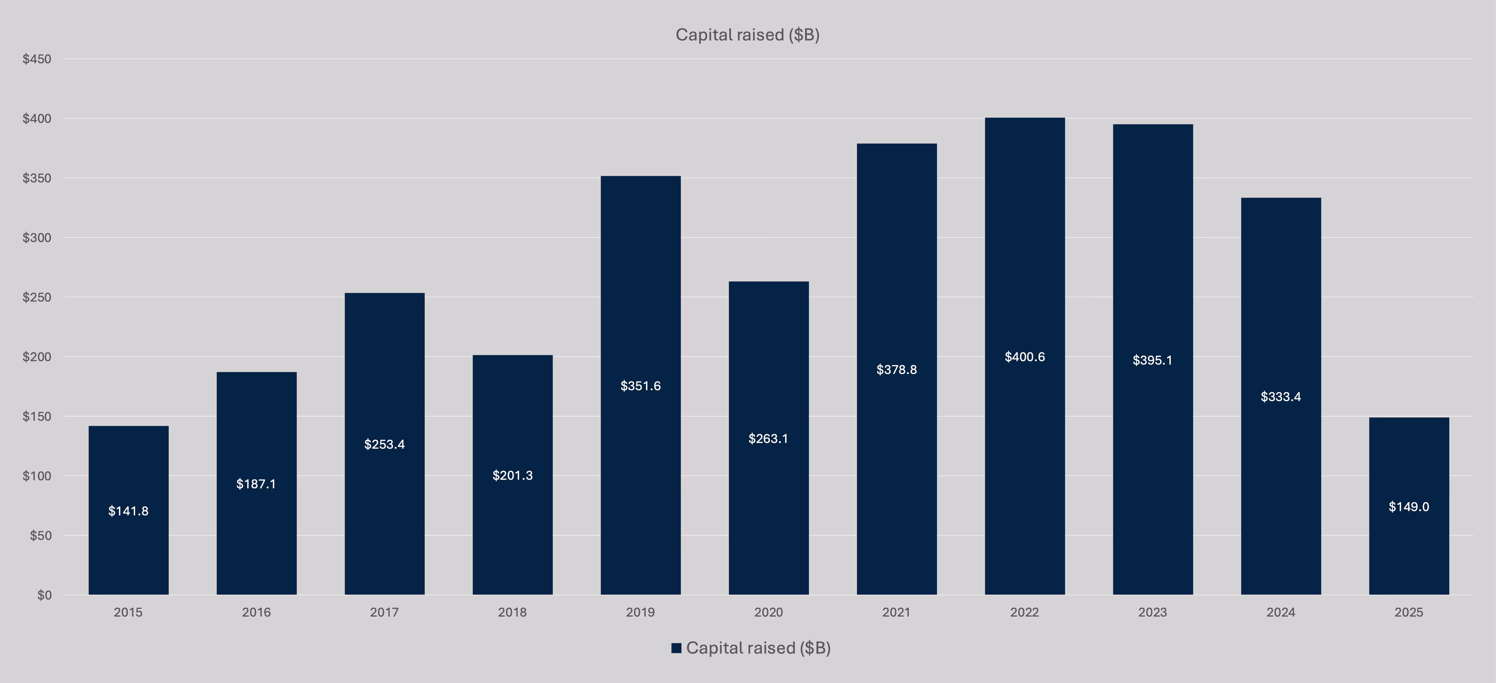 Q2 2025 saw an uptick in fundraising activity with ~$149bn raised for the year, relative to only ~$57bn through Q1. However, the H1 2025 total of ~$149bn is below the ~$155bn raised in H1 2024, and the current fundraising pace would place the year’s total ~$35bn below 2024’s ~$333bn raised. Additionally, 2025 fundraising has been driven by megafunds with ~59% of capital raised in 2025 going to funds over $5bn, relative to only ~40% in 2024. Continued economic uncertainty has depressed fundraising momentum with investors particularly cautious allocating capital to smaller funds.